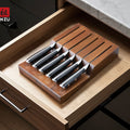 Si la lame est très sale ou si des aliments sont restés collés, vous pouvez utiliser une brosse à poils doux pour la nettoyer délicatement. Après avoir nettoyé et aiguisé la lame, appliquez une fine couche d'huile sur la lame et le manche. Après avoir nettoyé et aiguisé la lame, appliquez une fine couche d'huile sur la lame et le manche, afin d'éviter la rouille et de maintenir le couteau en bon état.Enfin, rangez le couteau dans un endroit sûr et sec, à l'abri de la chaleur et de l'humidité. Enfin, rangez le couteau dans un endroit sûr et sec, à l'abri de la chaleur et de l'humidité. Un bloc à couteaux ou un organisateur de tiroirs à couteaux est une bonne option, car il protégera la lame et évitera les accidents.