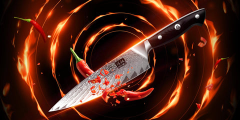 Il motivo della foglia ricorda i raggi del sole, ecco perché lo chiamiamo SERIE SOLE. Lo strumento più importante nella tua cucina. Questo coltello versatile eccelle in qualsiasi compito o tecnica di taglio.