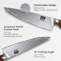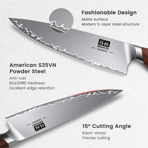 Le couteau de chef Shanzu utilise de l'acier en poudre américain S35VN d'une dureté de 62±2HRC comme noyau d'acier. La lame présente un excellent tranchant et une grande stabilité pour un affûtage de longue durée.