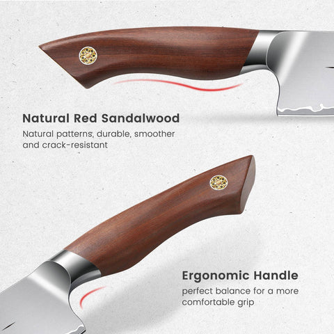 le manche du couteau de chef sharp knife est fabriqué en bois de santal rouge naturel, conserve son motif d'origine, est durable et lisse, résiste aux fissures et la courbure du manche est soigneusement conçue. Il est plus ergonomique et plus confortable à tenir.